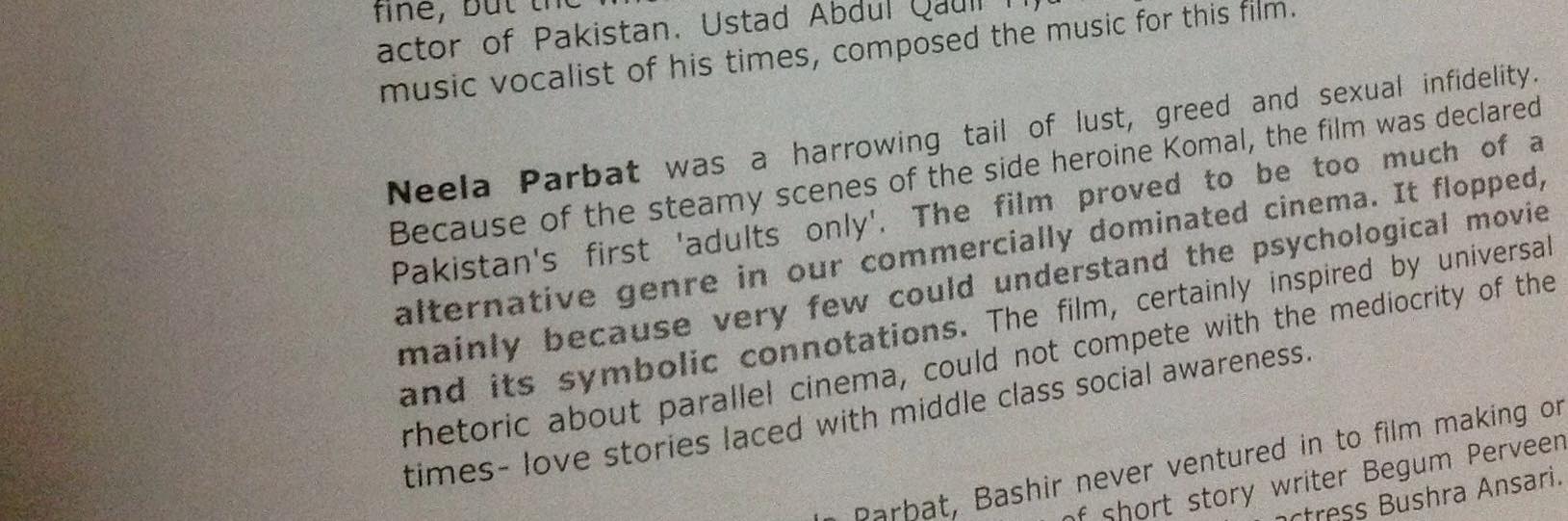 احمد بشیر ذہین ادمی تھے بشری انصاری اور نیلم احمد بشیر نے ذہانت باب سے ورثے میں پائی قیام پاکستان کے بعد احمد بشیر نے Hollywood سے فلم بنانے کی تربیت حاصل کی ممتاز مفتی نے کہانی لکھی اور احمد بشیر نے اس کہانی کو “نیلا پربت ” کے نام سے فلم کی صورت میں ڈھالا وہ فلم وقت سے پہلے بنائی گئ تھی اور اس کو ہم پاکستان کی پہلی آرٹ فلم بھی کہہ سکتے ہیں کچھ تصاویر اس فلم سے متعلق اپ کے ساتھ بانٹ ریا ہوں اس فلم سے متعلق یہ تحریری و تصویری مواد میں نے 18 برس پہلے